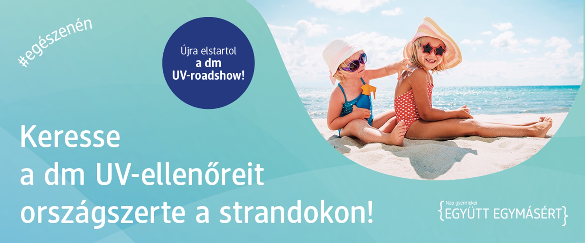 15 éves jubileumát ünnepli idén a Nap gyermekei programunk. Ennek az edukációs pályázatnak kezdetektől fogva fontos része az egész nyáron át tartó dm UV-roadshow, aminek keretében a dm UV-ellenőrei járják az ország népszerű fürdőit, hogy elsőkézből hívják fel a nyaralók figyelmét a helyes napvédelem fontosságára.
